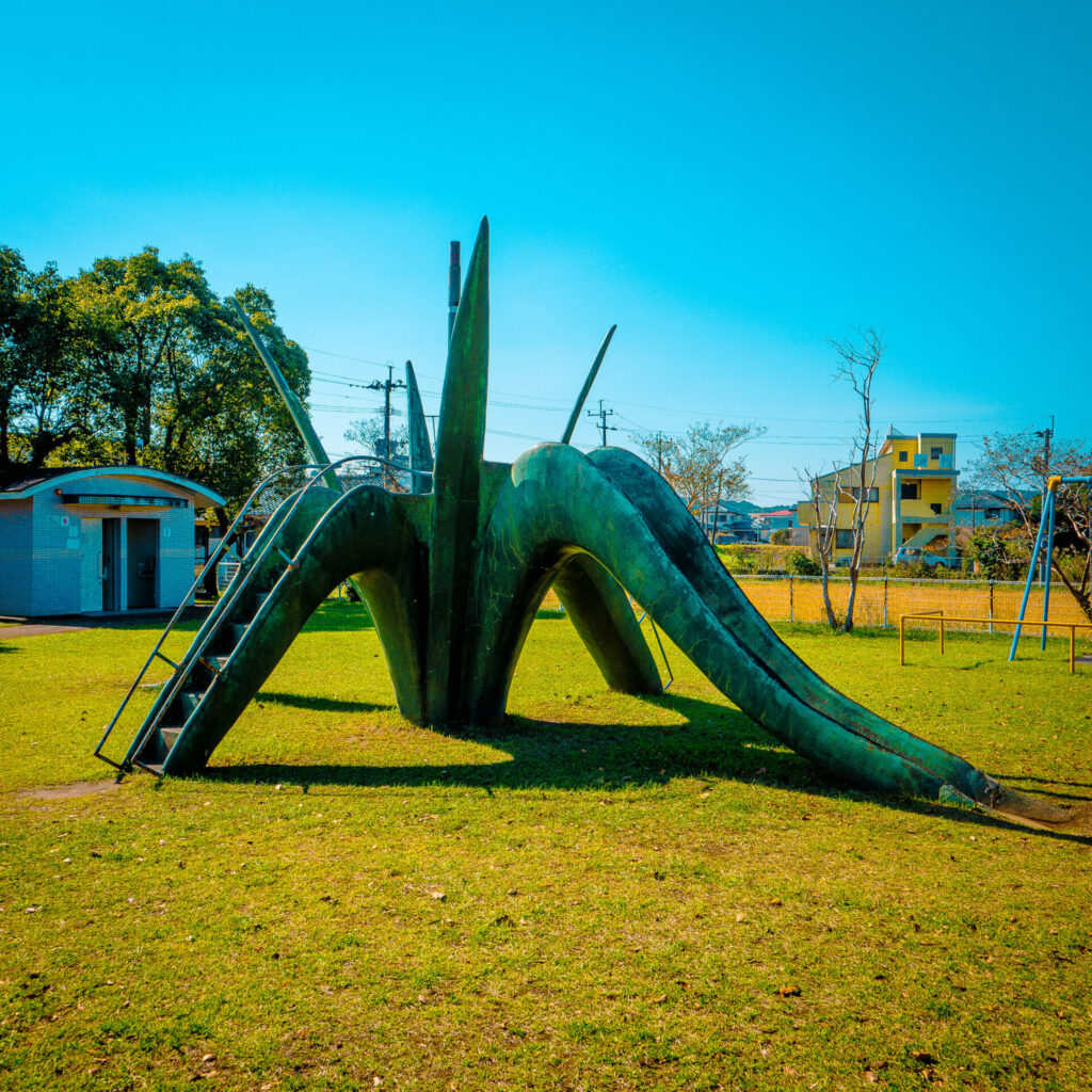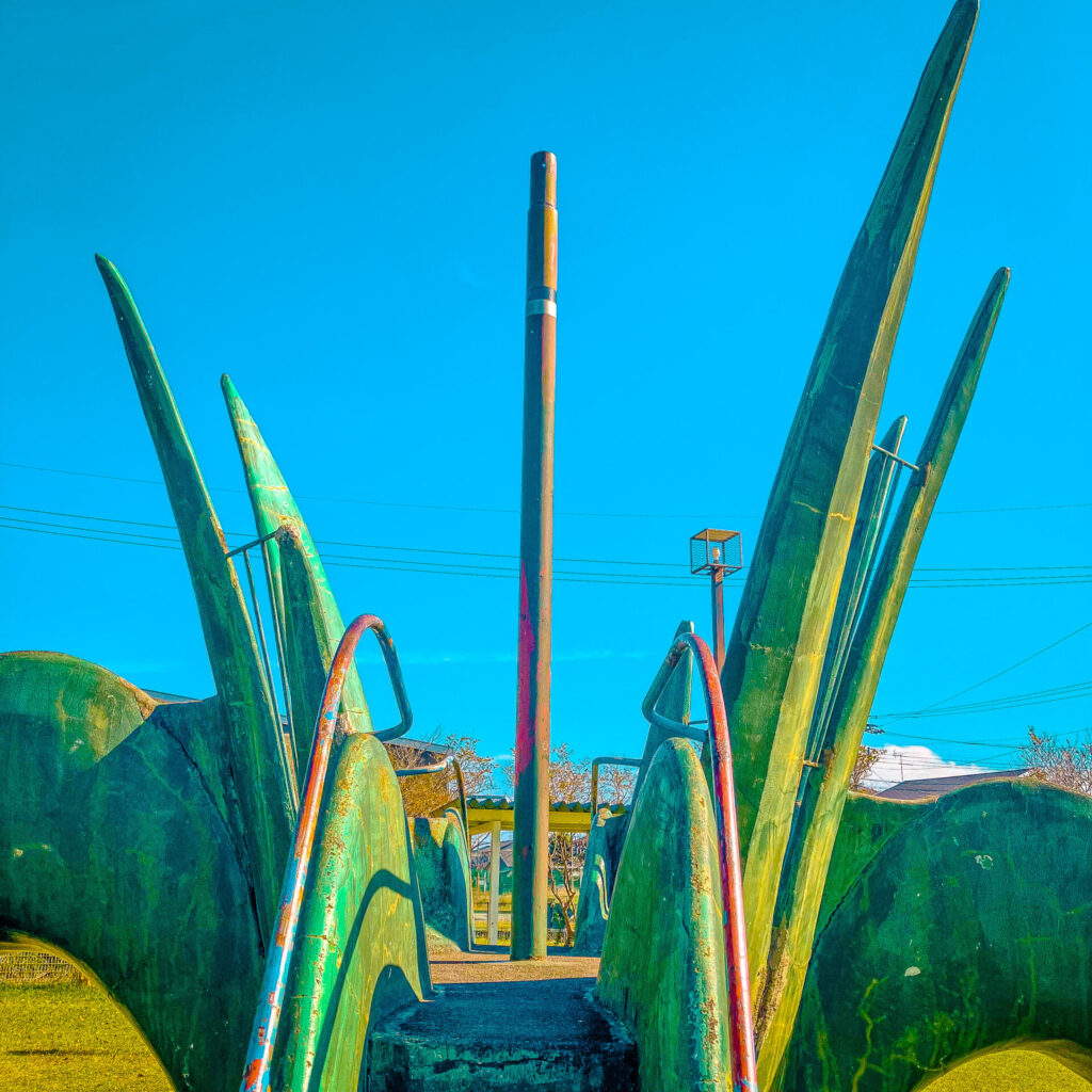 宮崎県でしか見たことのない、「イガイガのすべり台」。すごく見た目は強そうなすべり台。アロエの化け物というか、地中から突き出してきた巨人の手というか……。これをなぜにすべり台に、いや、公園遊具にしようと思ったのだろうか?